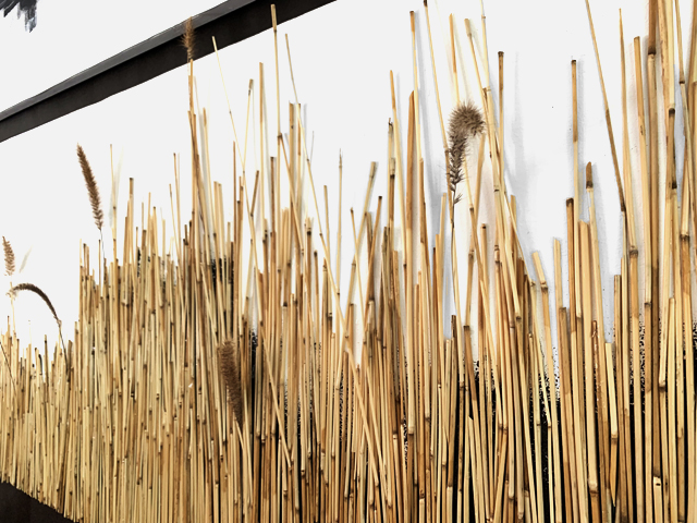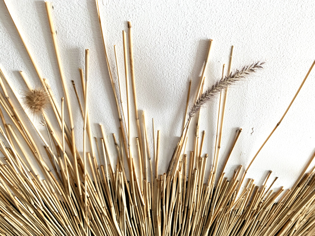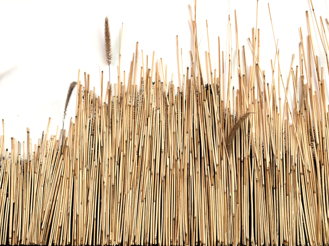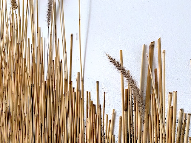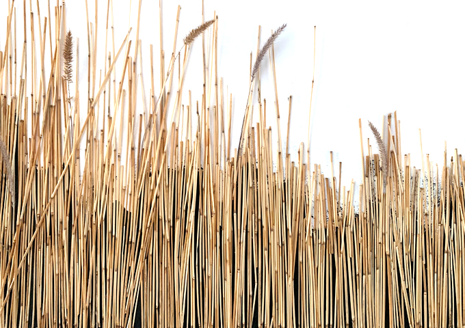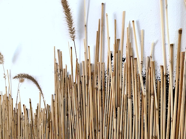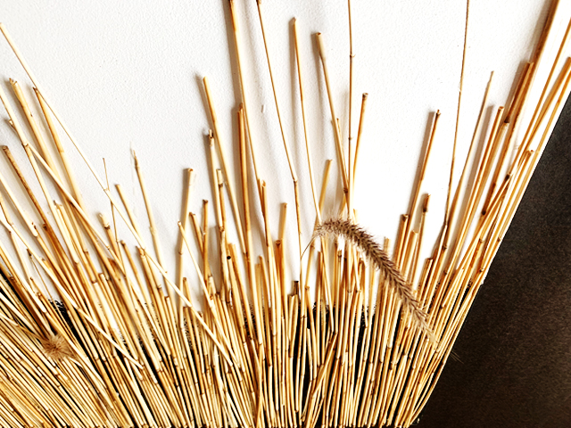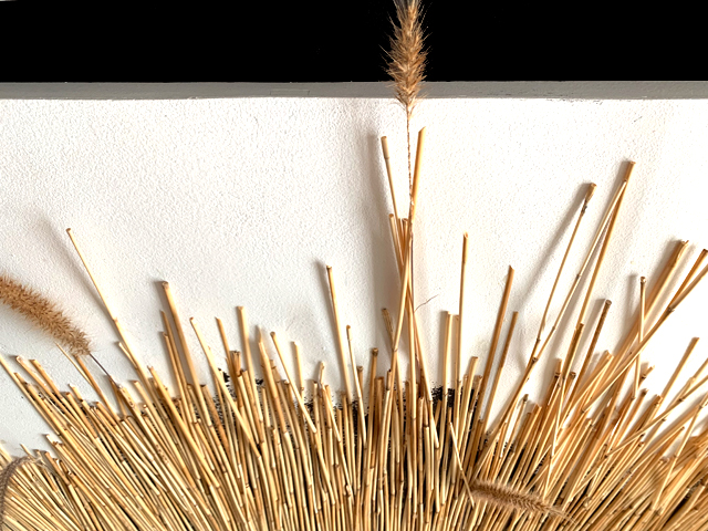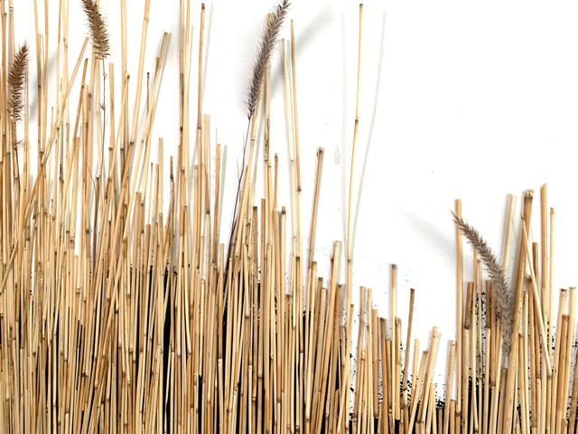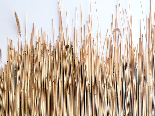 Mixed media (including dessicated prairie vegetation and small lumps of anthracite coal) on wood panels.
